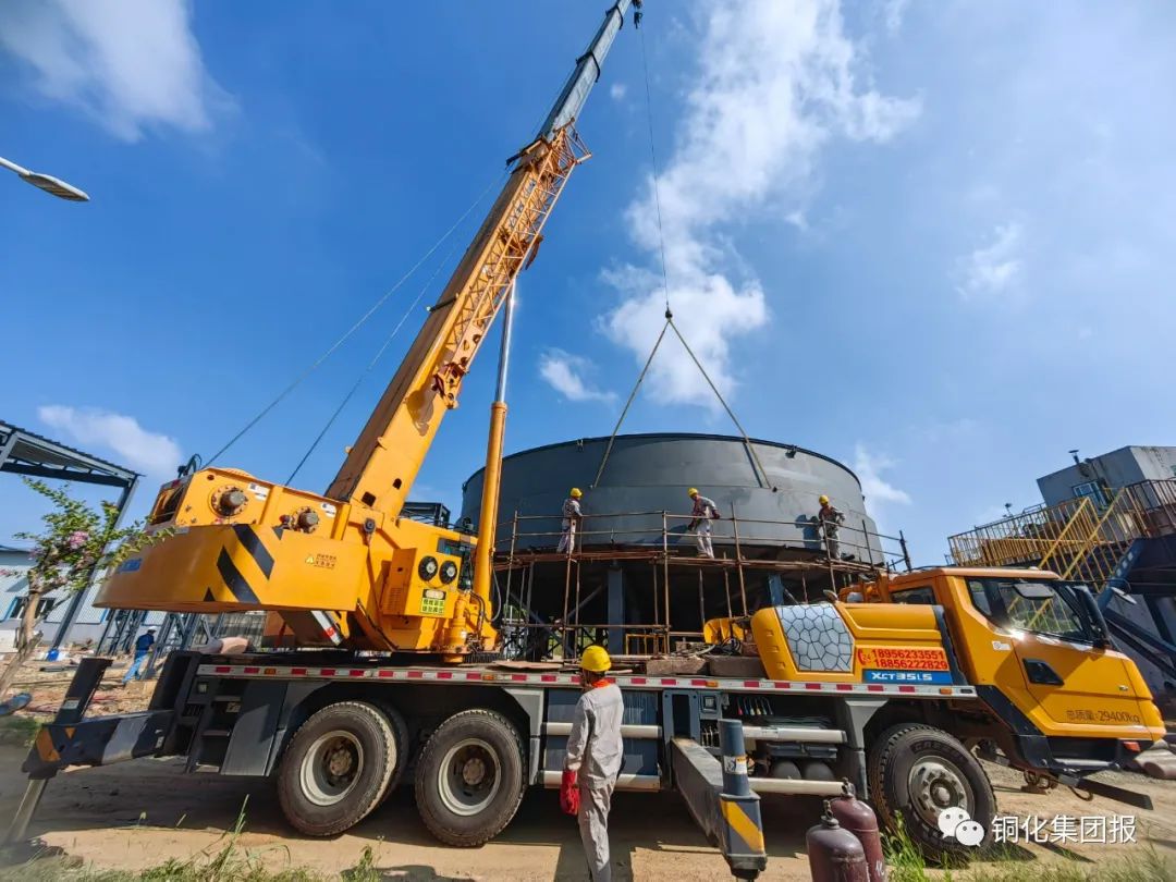 項(xiàng)目完工投用后,每年可處理選礦廢水247.5萬立方米、酸性廢水1000萬立方米,去除COD1485噸、硫化物146.03噸、重金屬錳208噸,在保障原生產(chǎn)線正常運(yùn)行的同時(shí),顯著降低相關(guān)污染物排放,實(shí)現(xiàn)外排水水質(zhì)穩(wěn)定達(dá)標(biāo),有效保護(hù)當(dāng)?shù)厮h(huán)境,環(huán)境效益和社會(huì)效益顯著。上圖為吊裝作業(yè)現(xiàn)場(chǎng)。