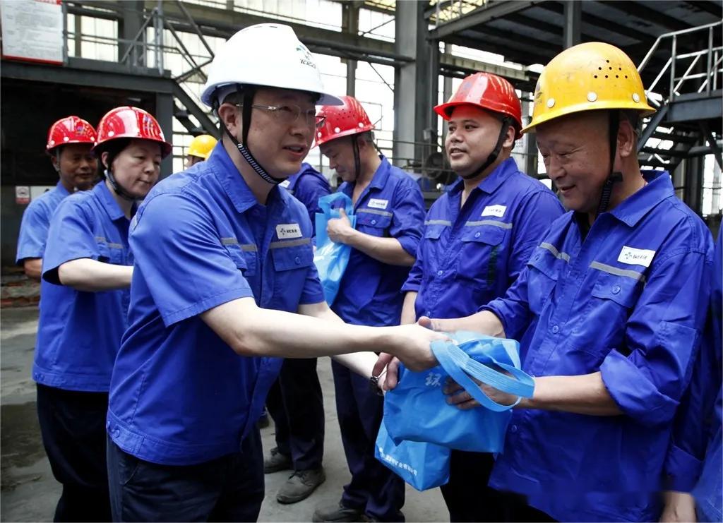 在磨浮車間,吳亞和陳彬?qū)⒁环莘荨扒鍥觥倍Y包送到員工手中,感謝大家戰(zhàn)高溫,守崗位,為公司上半年生產(chǎn)經(jīng)營做出的突出貢獻,同時叮囑大家注意休息、勞逸結(jié)合。