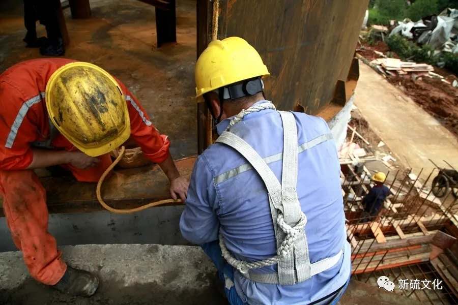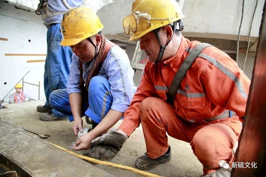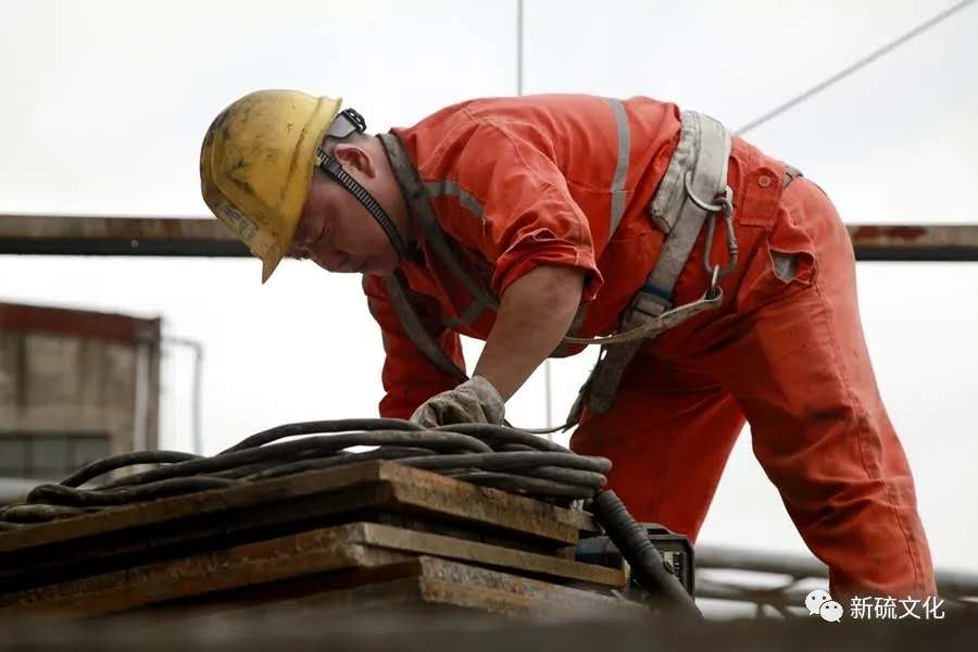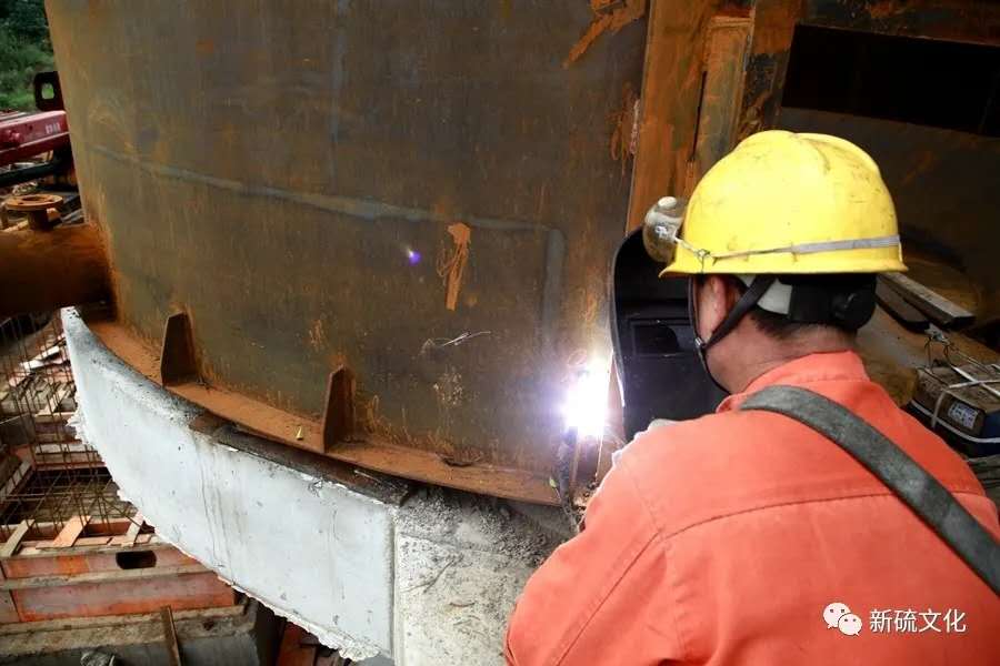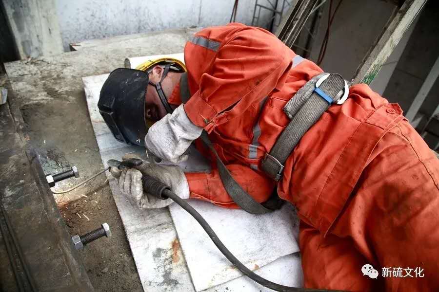 地面上大吊車、大貨車,選礦廠相關(guān)負責(zé)人、技術(shù)人員、安全員等忙著起吊龐然大物時,“焊高組”在底座上也一刻沒閑著,拖運電焊設(shè)備、準(zhǔn)備焊接材料、在底座上鋪水泥保持平面,各個槽體支腳找平衡......由于底座緊挨著磨浮車間,空氣不流通,加上天氣悶熱難擋,武裝整齊的好“焊”們一會就汗?jié)窳斯ぷ鞣?,汗珠順著安全帽壓著的發(fā)根往下滾。
